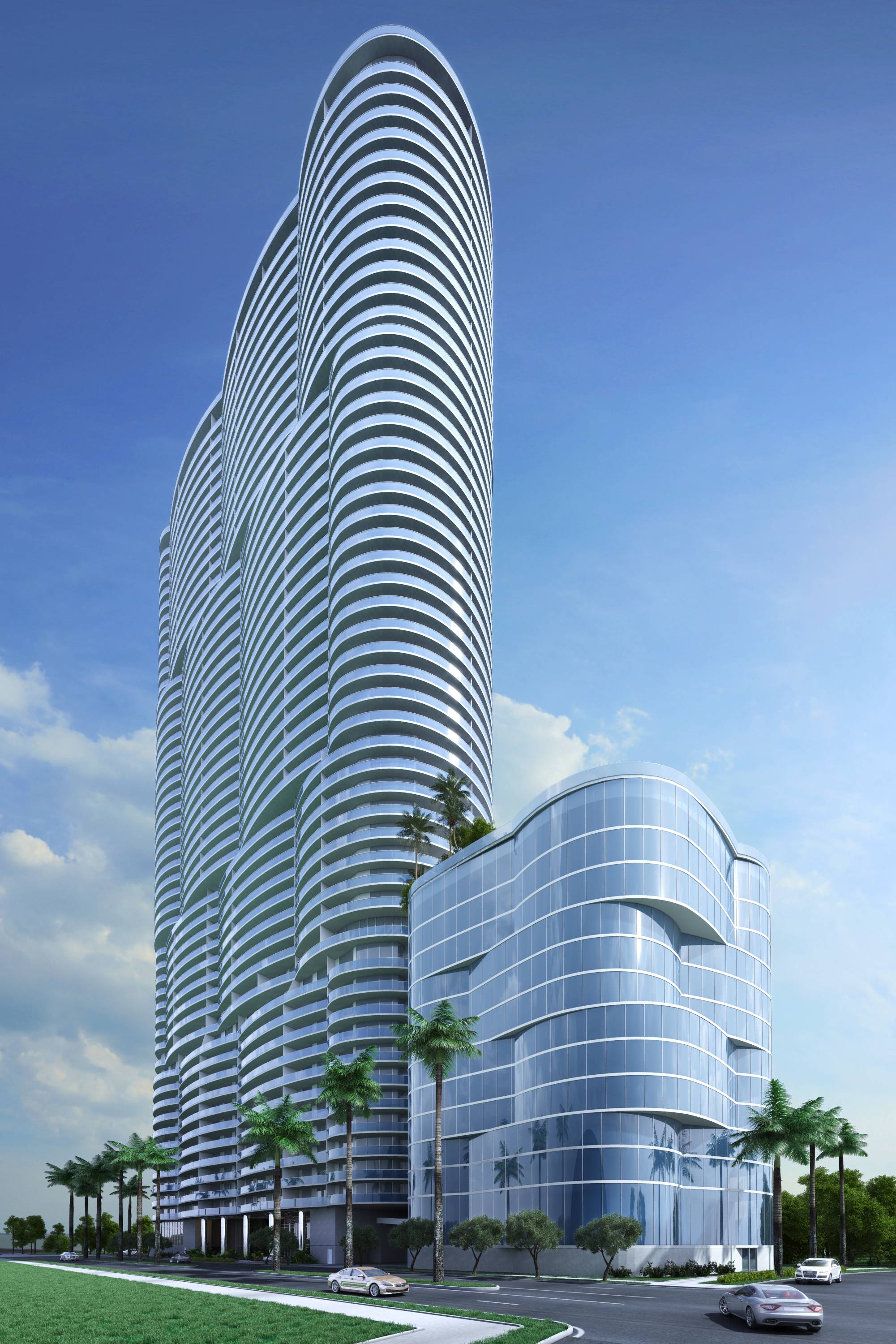 AEInterests: Curvilinear, sleek smooth lines, designed to reduce need for cooling during the summer, large balconies with glass everywhere, built to withstand hurricanes