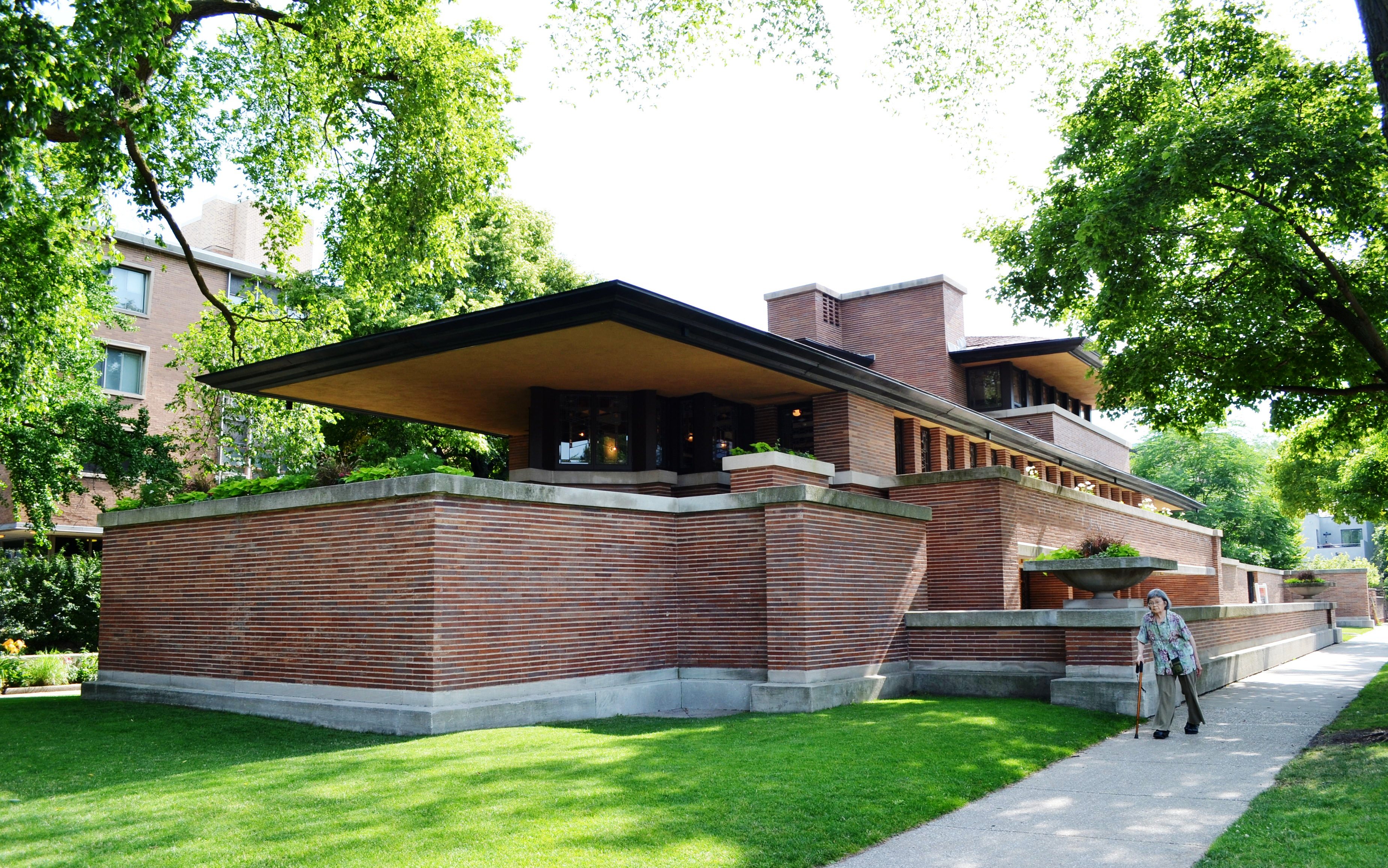 AE Interests: prairie school, double-wythe masonry, iron-spotted Roman brick, cantilever roof, structural steel
