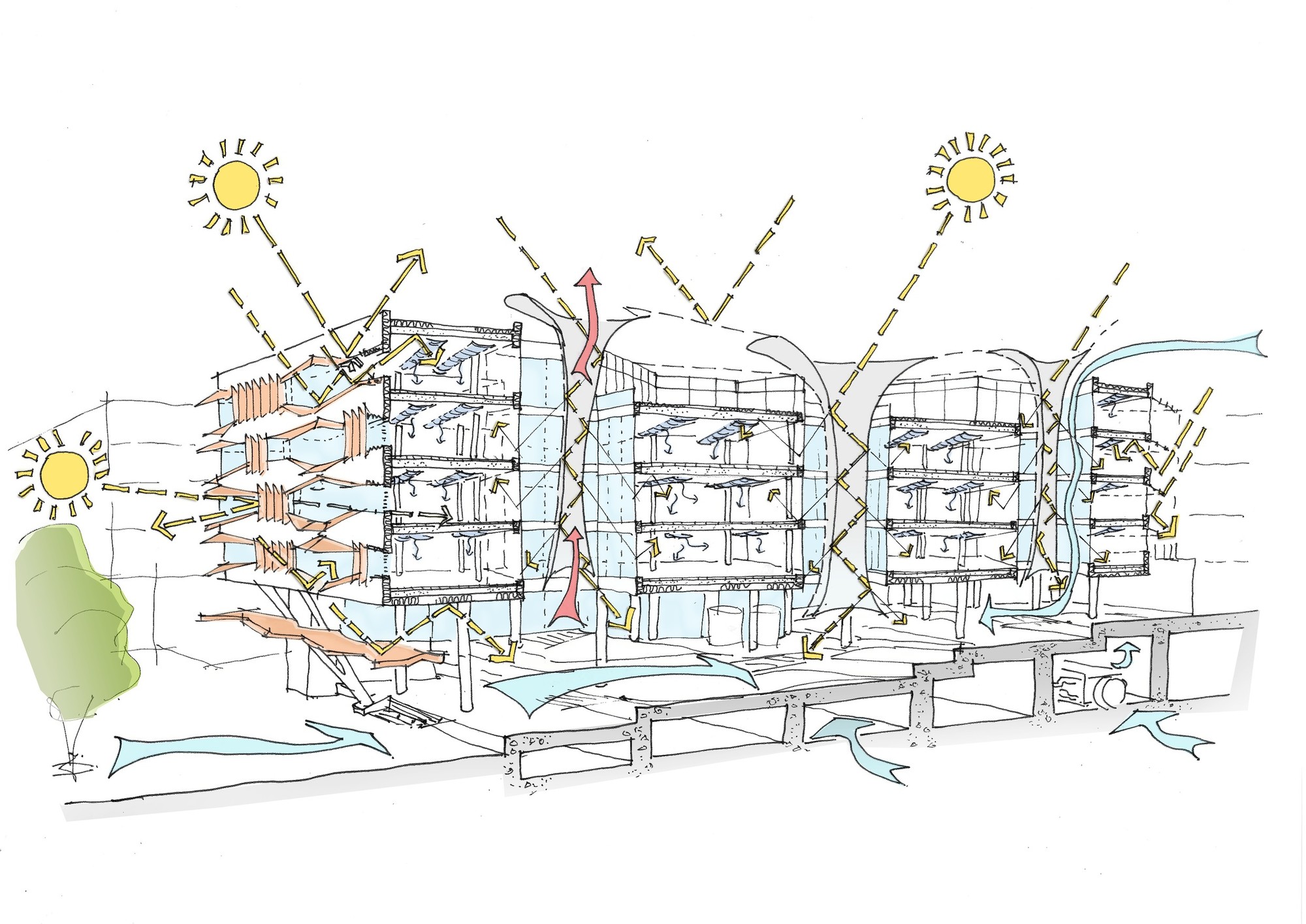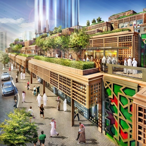 AEInterests: Individual facade glazing using Arabic geometry, green roofs, high energy efficiency, open roofs to implement natural lighting and cooling.