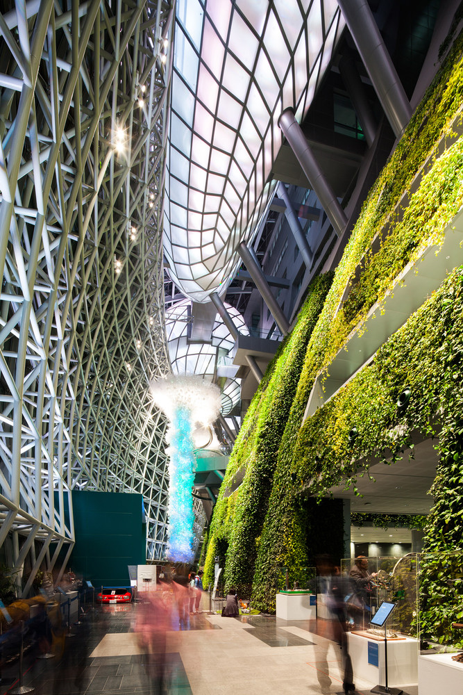 AE Interest: Promote public space, triangular windows create the illusion of curved glass, solar shading, worlds largest green wall, geothermal heating and cooling system, perforated floor to absorb thermal energy.