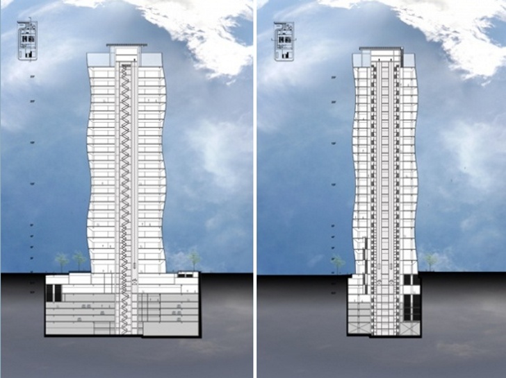 AE Interest: Structural slabs offset on each floor, glass facade to mimic wave motion, optical illusion, light as a decoration, architectural unit with a GT Tower West, solar panels,
