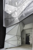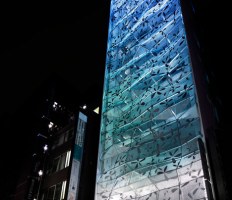Consists of an aluminum facade that resembles a crumbled up wrapper. Lighting behind the metal facade that changes colors according to season.