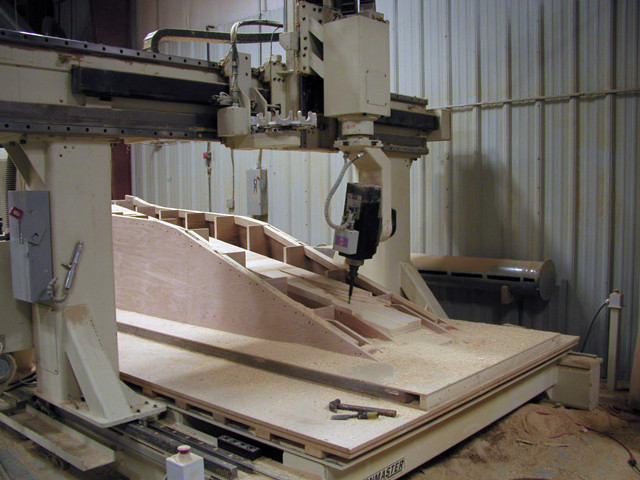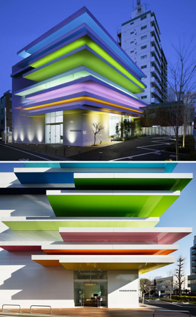 Front facade covered with a stack of 12 colored layers. Three elliptical skylights in entrance of building.