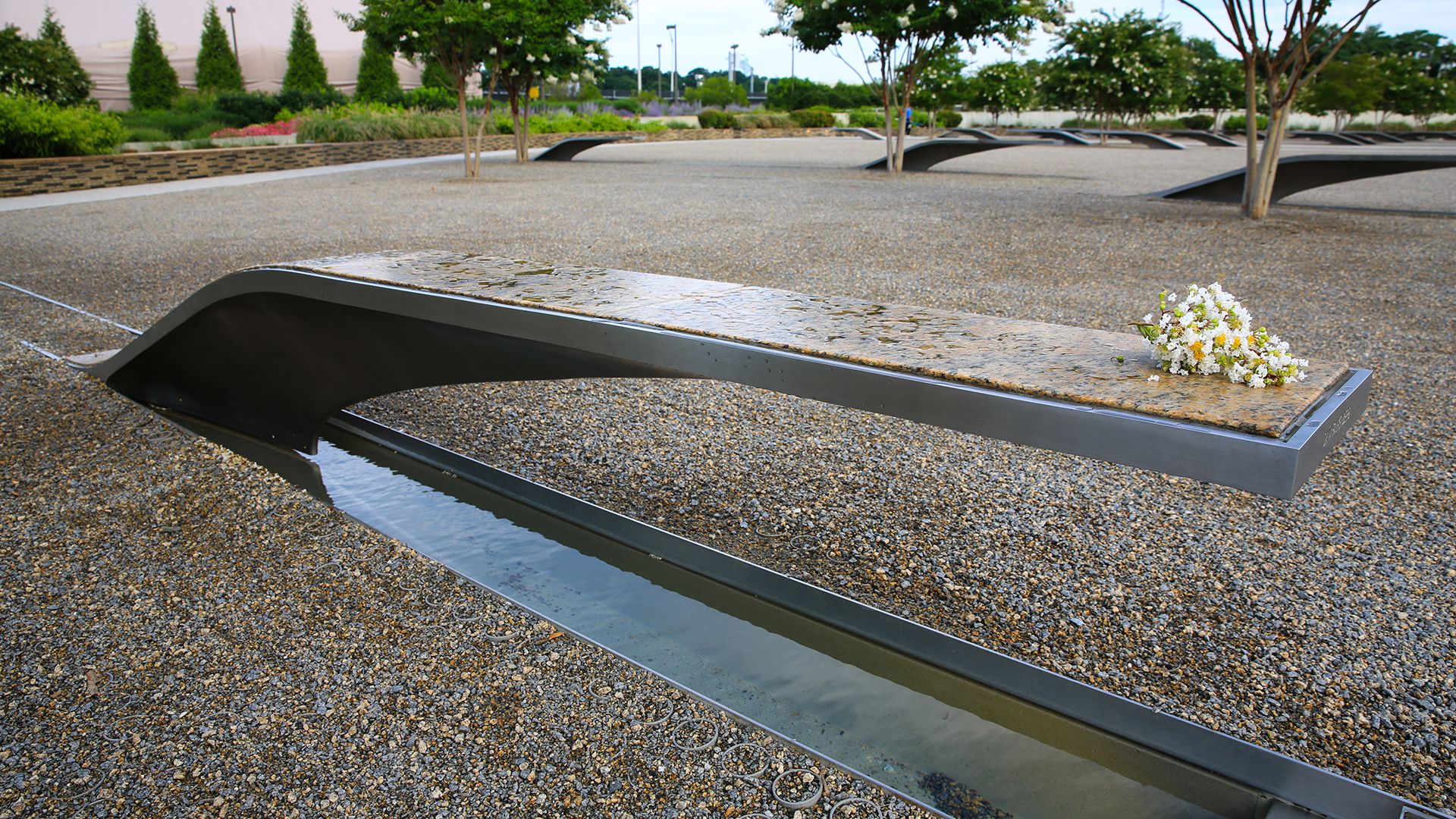 AE Interests: Stainless steel cantilevered benches inlaid with granite over a lighted pool of flowing water, 125 benches facing the pentagon for those who died in the building, 59 benches in direction of the flight path of the doomed plane, Increasing/decreasing height based on the age of the victim