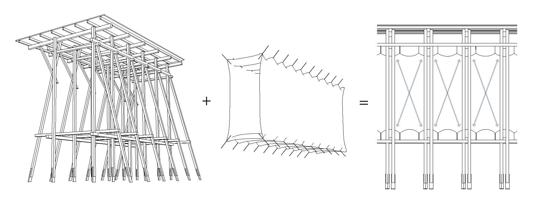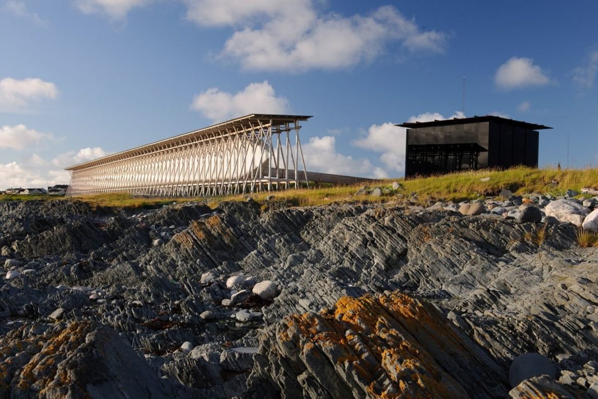 AE Interests: pine scaffolding framework holding a fabric cocoon with a long oak-floored corridor, 91 windows for the 91 deaths during the Vardø witch trials, a second contrasting structure made of weathering steel and smoked glass with a circle of mirrors around a flaming steel chair in a hollow concrete cone like judges or silent witnesses circling the condemned