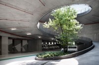 AE Interests: undulated concrete canopy, suspended catwalk connecting the two buildings, translucent glass facade, pilotis, public square for displaying sculptures between two buildings