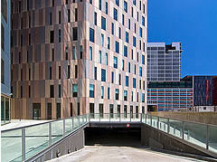 AE Interests: The two structures draw people into the central courtyard, which is surrounded by water on 3 sides. The sunken facades facing the water softens the transition from waterfront to the buildings.