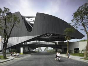 AE Interest: tiled cladding system wrapping around the boiler house fabricated from high grade stainless steel frames, with braid woven through as the “warp”