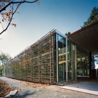 AE Interests: Minimal intrusion in the Montréal Botanical Garden, vertical surfaces minimized to limit visual impact, mostly outdoor space, materials left in an unfinished state, including the poured-in-place concrete of the roof that expose the rough wood formwork and corten steel in some walls