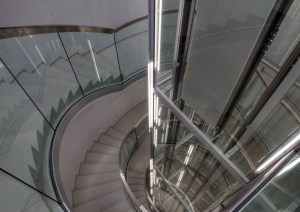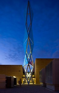 AE Interests: Exterior cylinder is composed of oxidized copper, pyramidal glass greenhouse houses a below-ground tiered garden and koi pond; interior is a two-story stone cylinder with several semi-circular concrete constructions scalloping the walls, and large-scale prisms fixed in skylights; exterior marble tower is a functioning clock