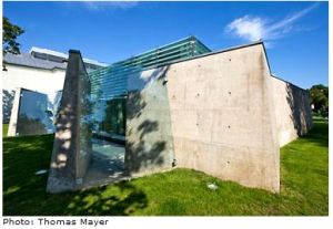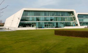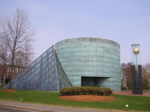 AE intersts: exterior glass curtain wall, sloping design blends with landscape, linear shape allows for expansion and flexibility.