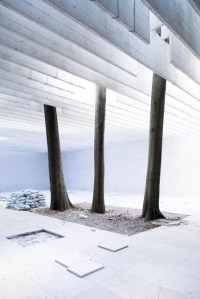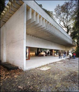 AE interests: balance of nature and building, crossing concrete beams comprise roof canopy, beams and tree branches diffuse harsh light, large windows for natural light