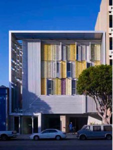 AE Interest: 75% recycling rate in overall project, custom water jet anodized aluminum panels on the main façade, double-pane windows, insulation made from recycled newspapers, water-saving dual flush toilets