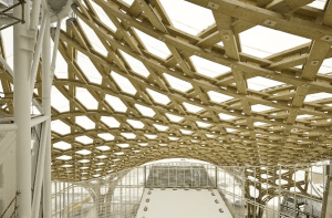 AE Interests: woven timber roof, tensile membrane of hexagonal modules, glass fiber, teflon