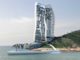 AEInterest: complex geometric structure, cantilevered restaurant, panoramic terrace, flexible exhibition areas, outer skin responds to climatic forces dynamically
