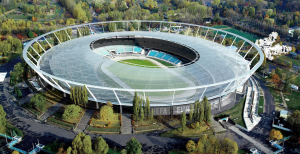 AE Interest: largest stadium roof in Europe, translucent polycarbonate cover, filigree cable structure, upper and lower external steel compression ring with stays at the inner edge of the roof, oval roof structure