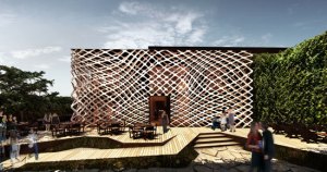 AE Interests: Tent-like structure built on existing warehouse, glass facade shaped like waves.