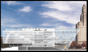 AE interests: Complex steel structure as well as pier foundation system. Some of the spans are in excess of 150 feet. The main convention floor is spanned by a combination of 3 catenery trusses and one arch truss that are approximately 1 1/2 stories, extending into the partitions walls of the third floor. The concept is a box on top of a box with the upper level rotated approximately 20 degrees. Additionally, the terrace on the second level over the main entrance is supported by two cantilevered trusses. The skin of the building is a combination of glass and perforated copper.