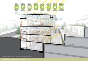 AEinterests: LEED Platinum certificate. Reused 93% of the existing factory. 100% High efficacy lighting. Has water heaters with rooftop solar collectors which cover 60% of the demand.