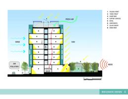 AE Interest: LEED Platinum Certification [a]; Evaporative cooling instead of relying on a chilled water system; Solar thermal evacuated tubes provide heating energy for the building [b]; Outlet timers; Natural lighting and daylight sensors; “Demand Control Ventilation” which only ventilates laboratory studios when necessary; Heat recovery units capture heat from exhaust air and recycle it for heating;